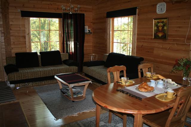 (jatkuvalämmitteinen puukiuas), pukuhuone, pesuhuone ja erillinen wc. Olohuoneessa on lisäksi kaksi levitettävää vuodesohvaa.